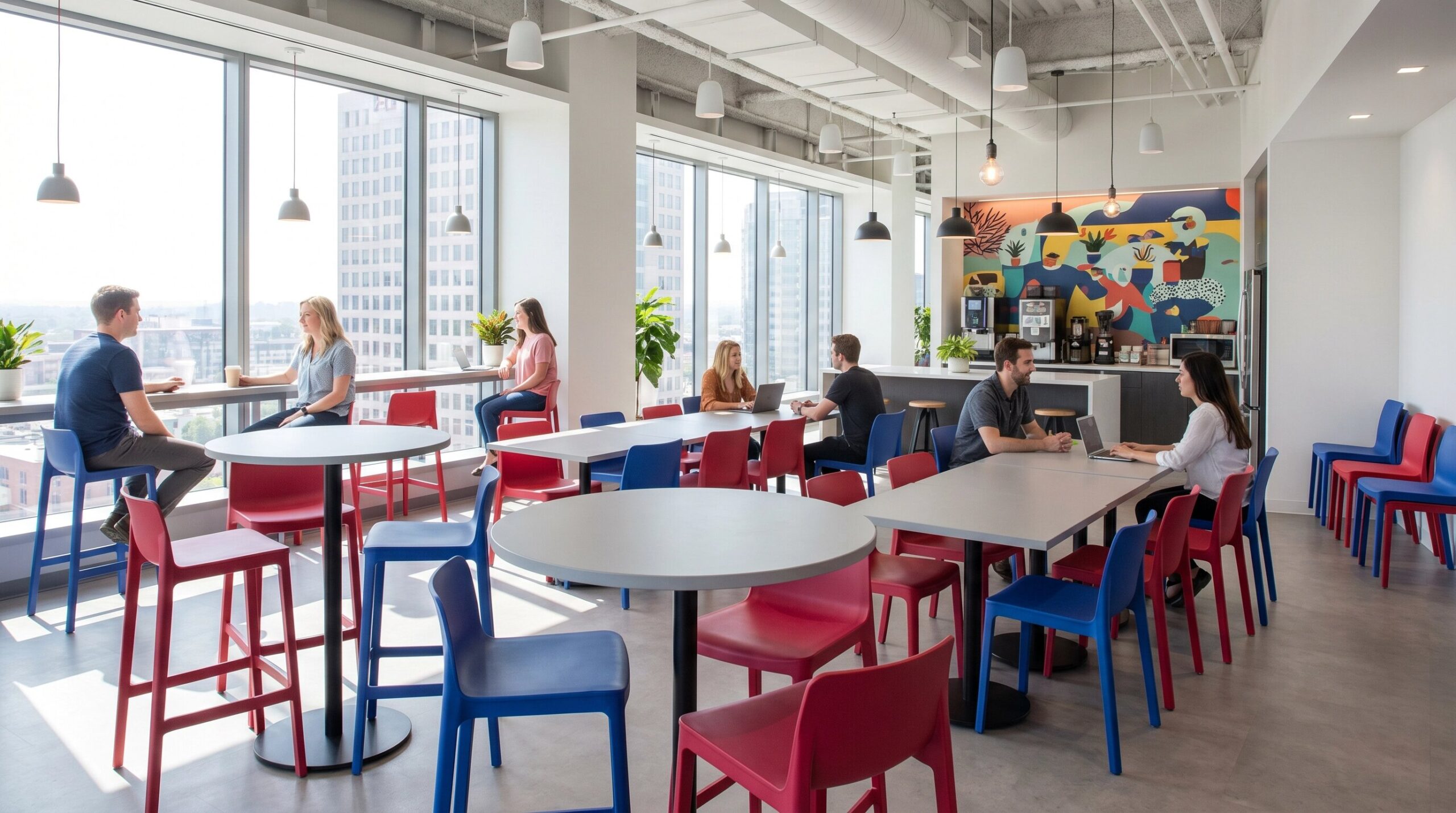 Light, colorful, and built to move. Our stackable seating brings a playful energy to dining and break areas. Shown here in a crisp palette of red, ivory, and beige, this setup is easy to rearrange, simple to clean, and ready for everything from lunch breaks to casual team huddles.