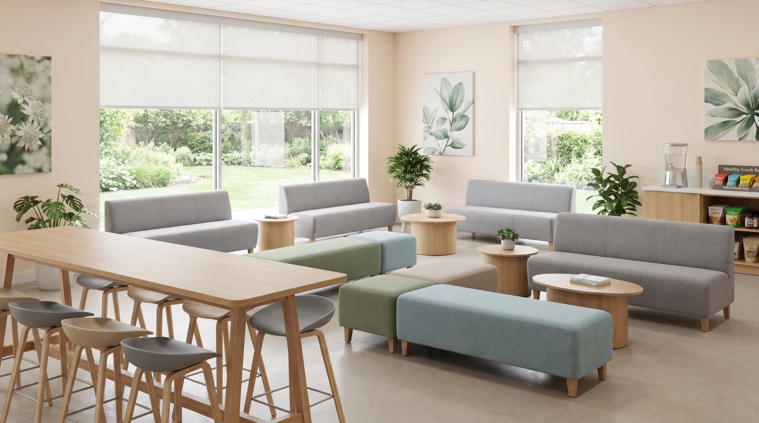 Ideal For: Break lounges, team retreats, and transitional areas that prioritize caregiver wellness and flow
