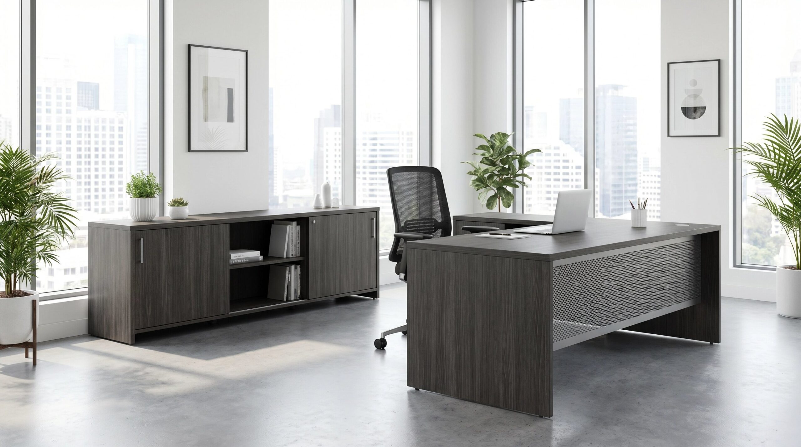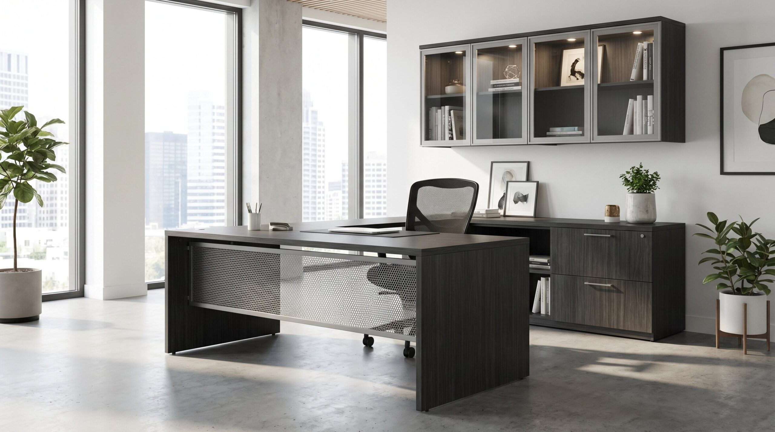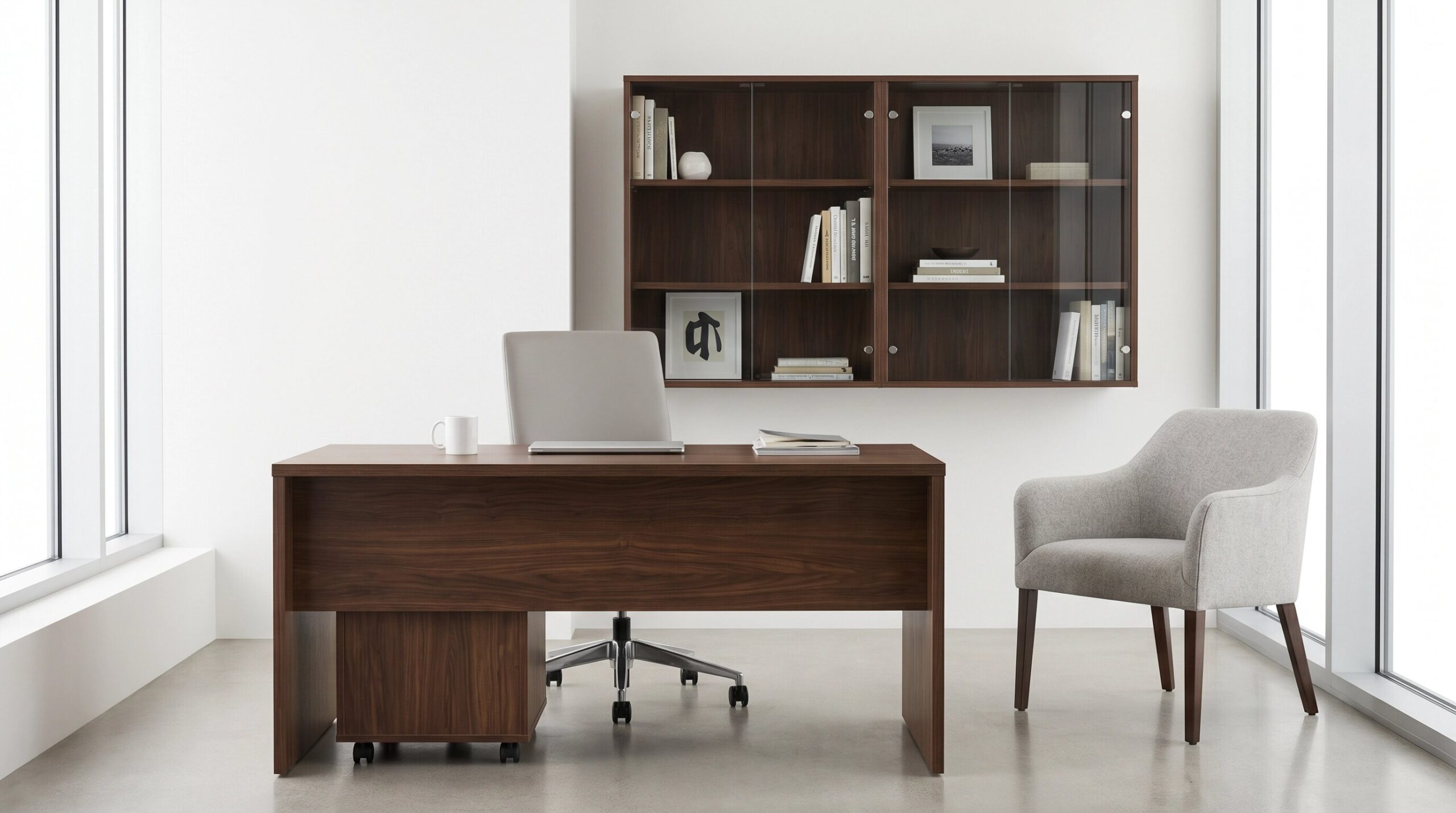 A polished executive office setting with smart storage, layered textures, and warm wood tones. Functional, elegant, and ready for big ideas.