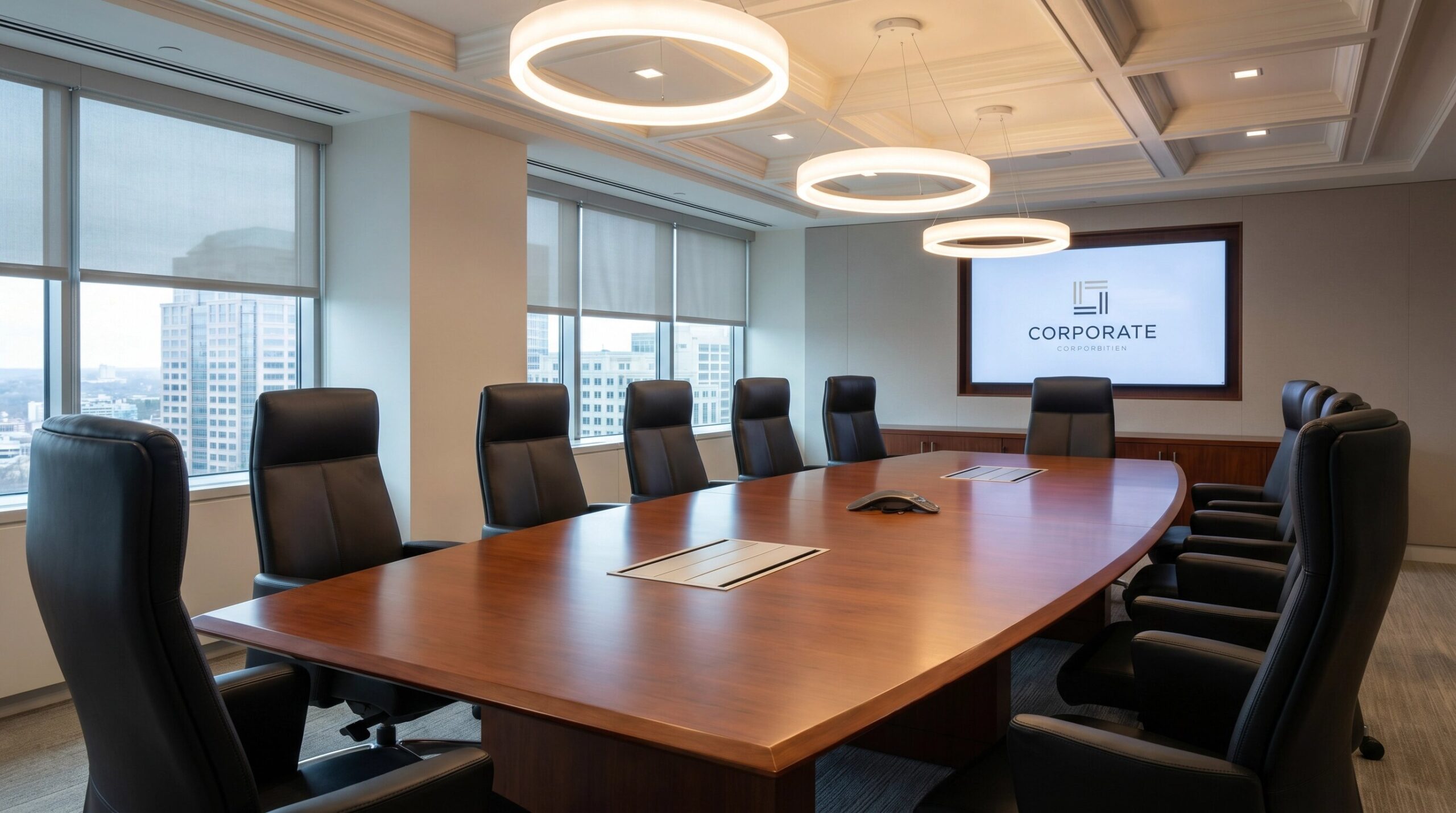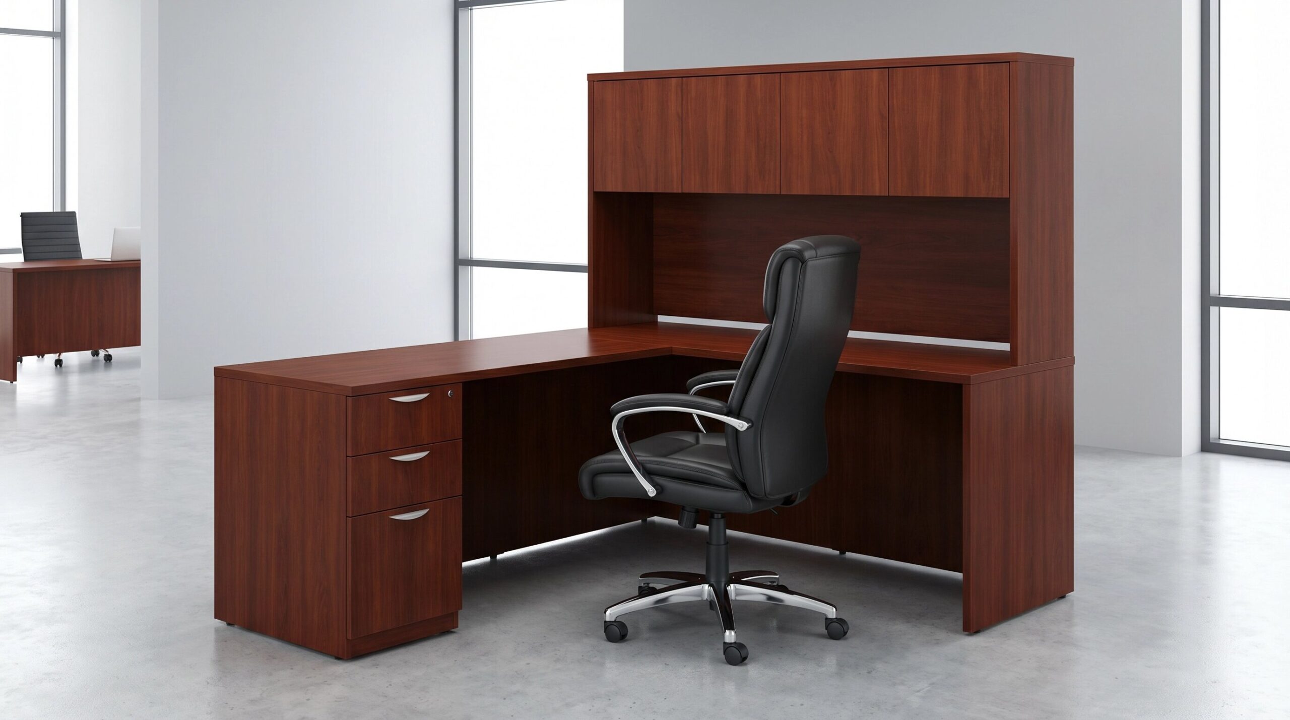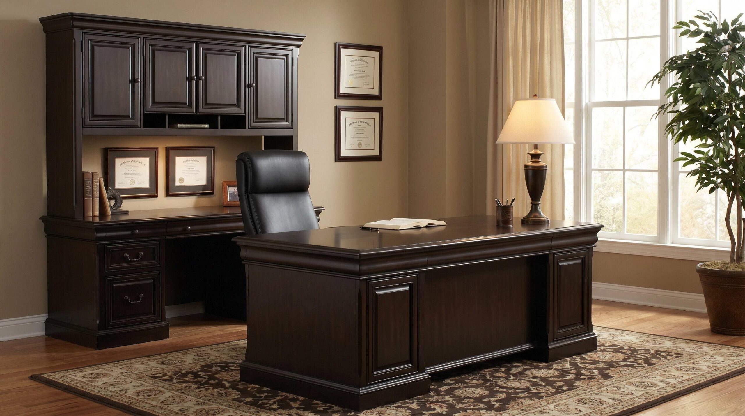 A polished executive office setting with smart storage, layered textures, and warm wood tones. Functional, elegant, and ready for big ideas.