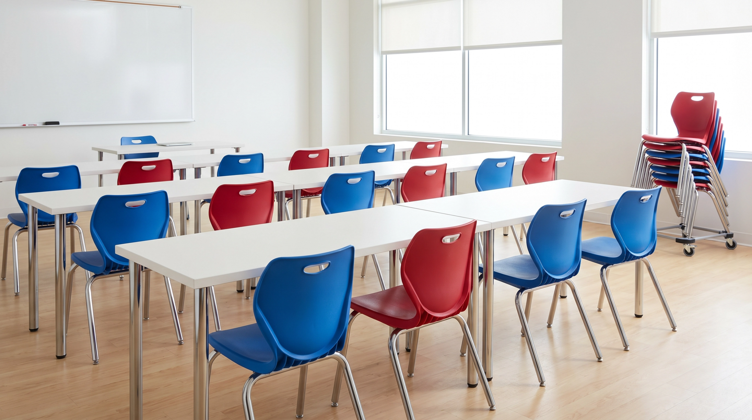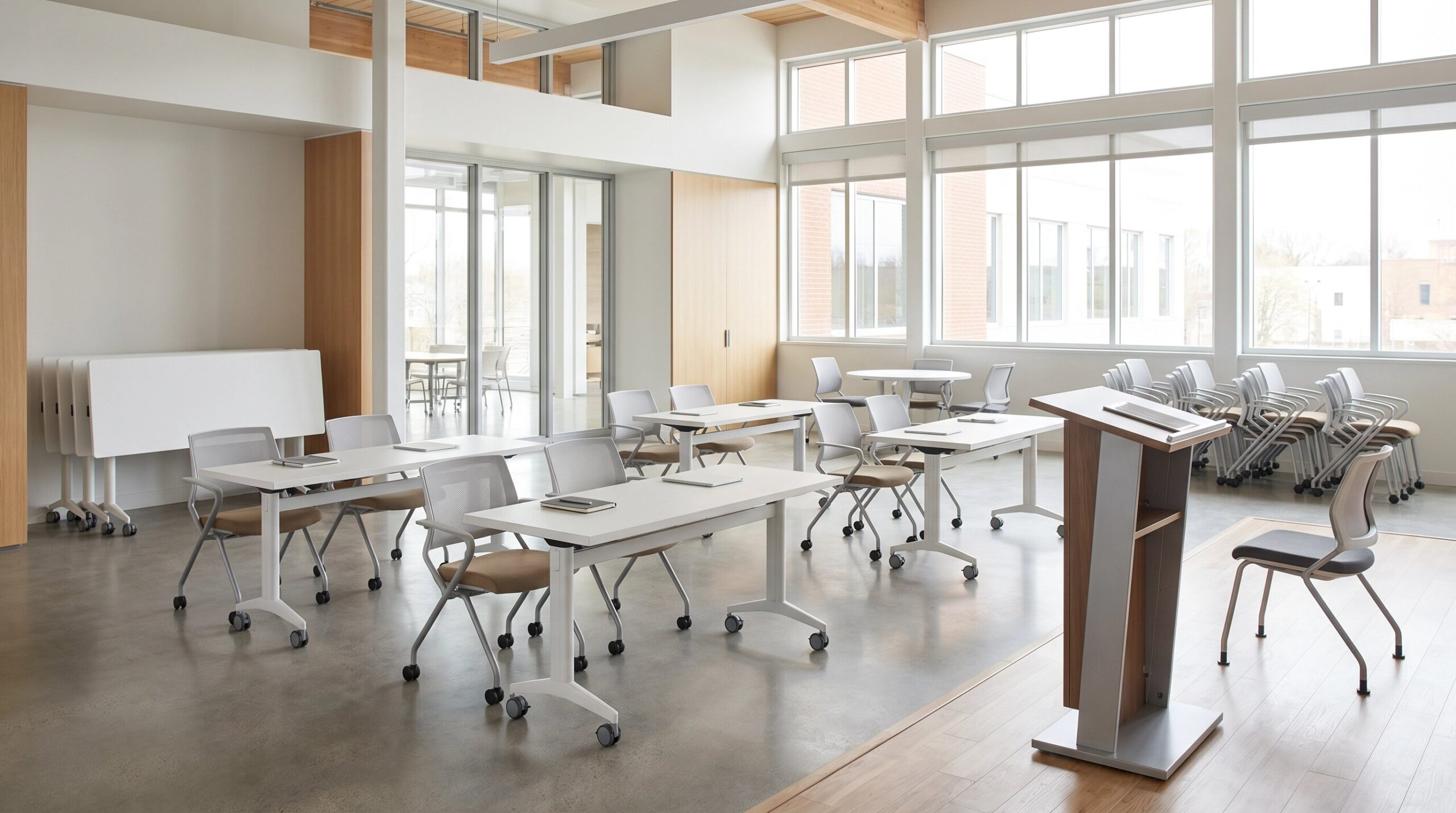 Designed with adaptability in mind, this setup features flip-top tables and stackable chairs for easy reconfiguring, quick storage, and smooth transitions between layouts. Ideal for classrooms, corporate training, or collaborative zones that need to reset often.