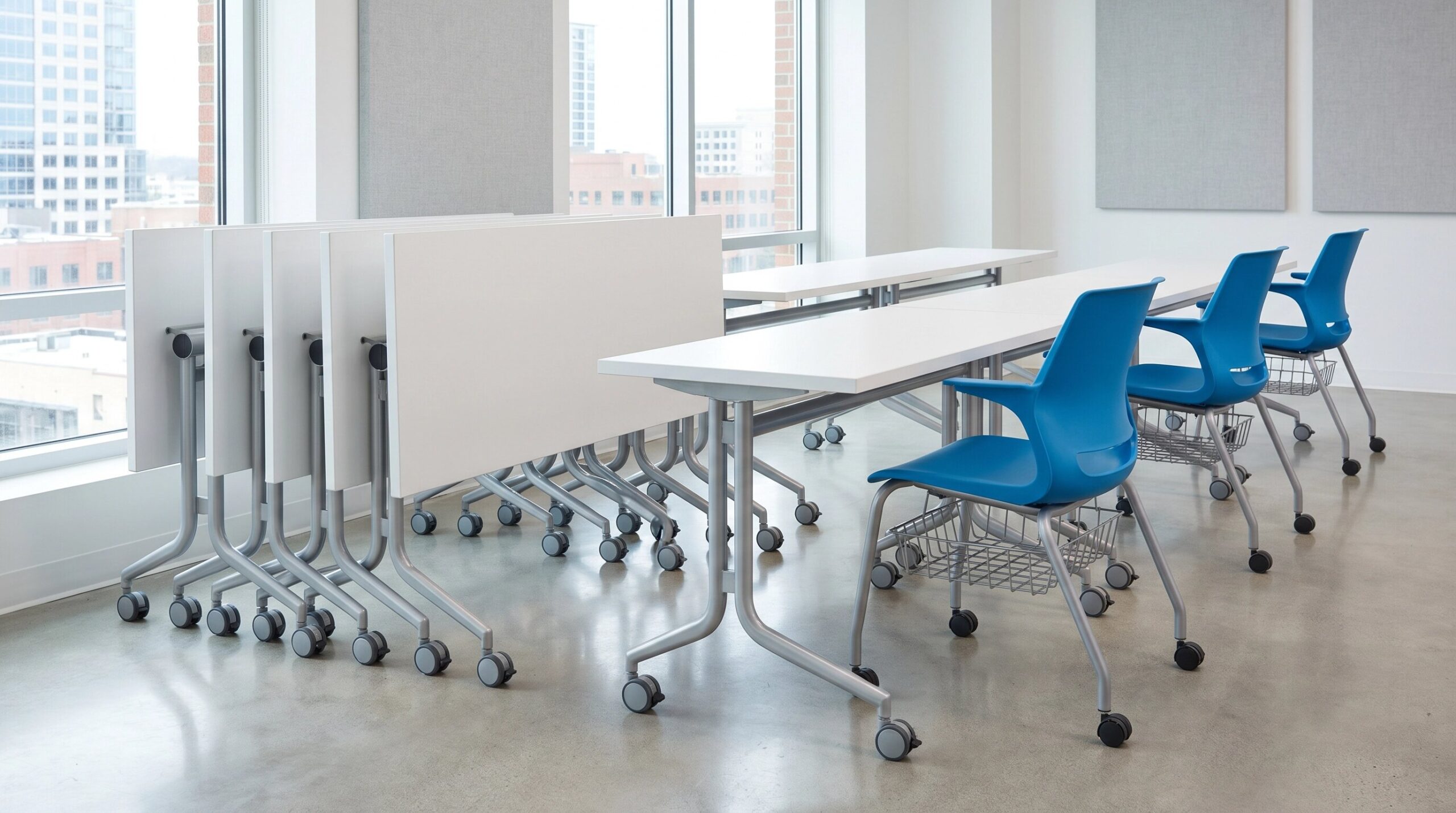 Tables: Rectangular tables on casters offer mobility and modularity, allowing quick reconfigurations for any setup