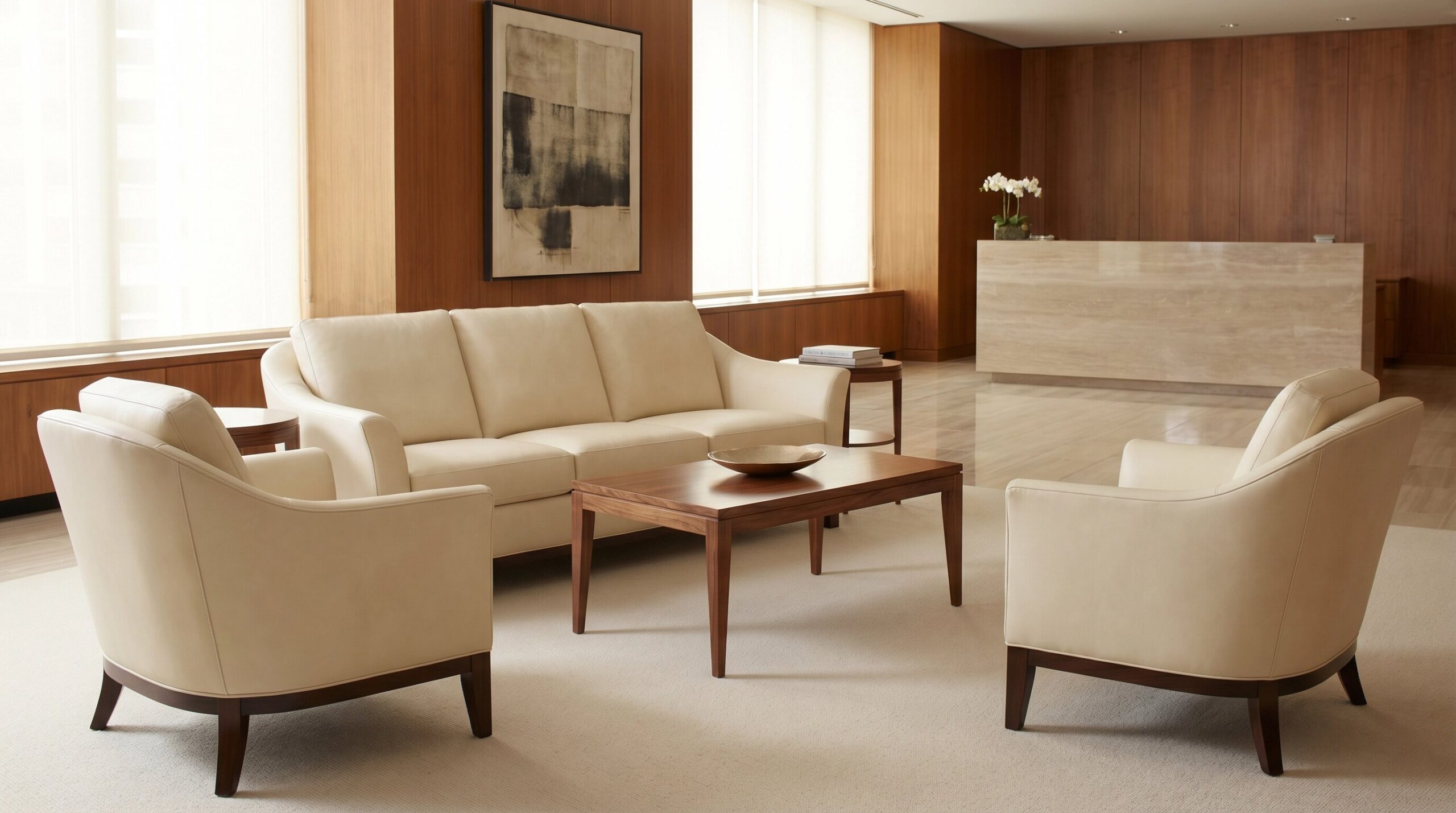 Sleek, structured, and designed for modern lobbies. This arrangement showcases our linear seating collection with soft premium upholstery in a light parchment tone and rich wood accent tables. Ideal for corporate reception areas or waiting spaces that value comfort with a clean-lined edge